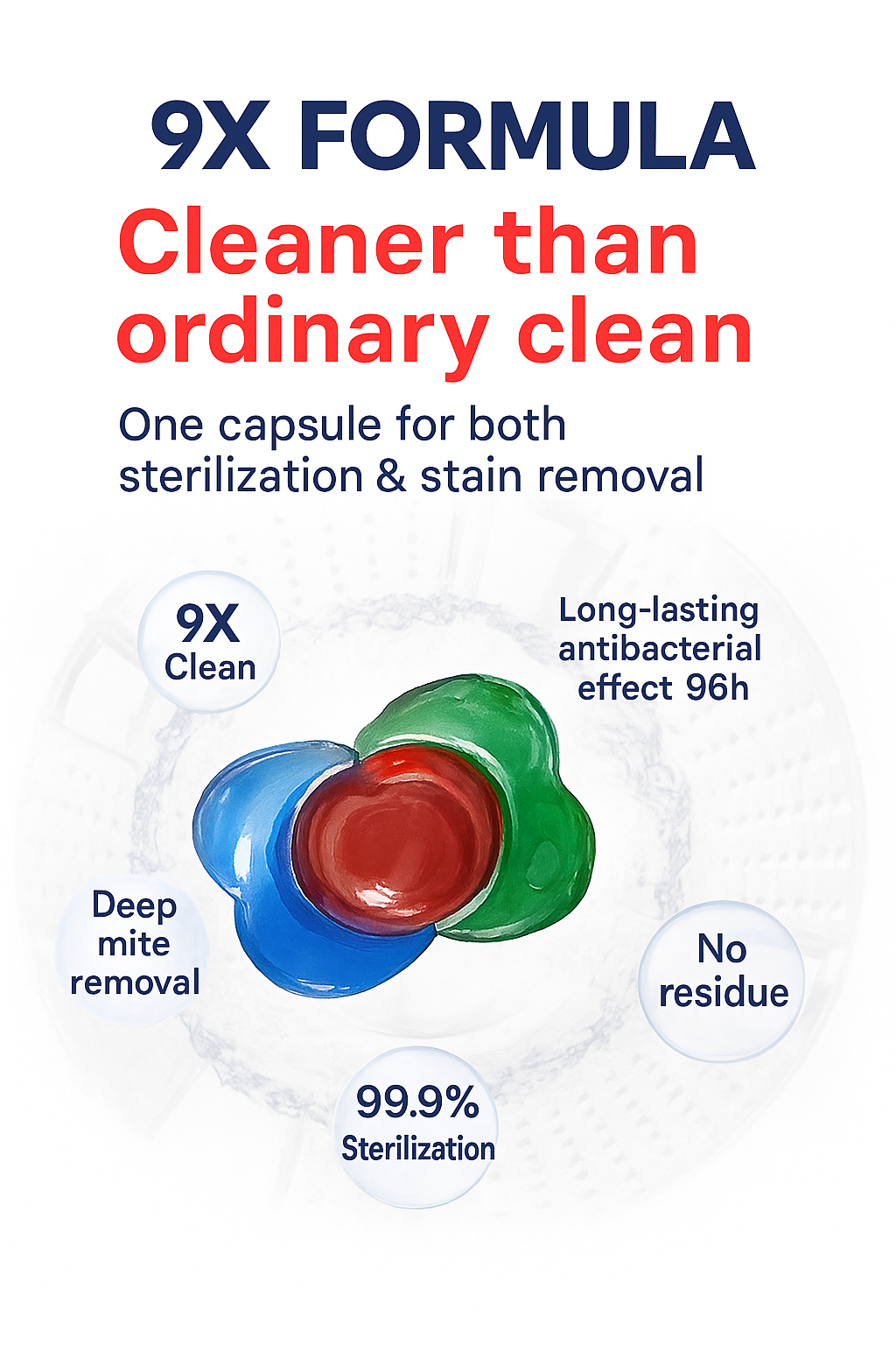 Każda kapsułka ma aż 18 g (zwykłe kapsułki w sklepach mają 14 g), co zapewnia 5-krotnie silniejsze czyszczenie i dłużej utrzymujący się zapach.