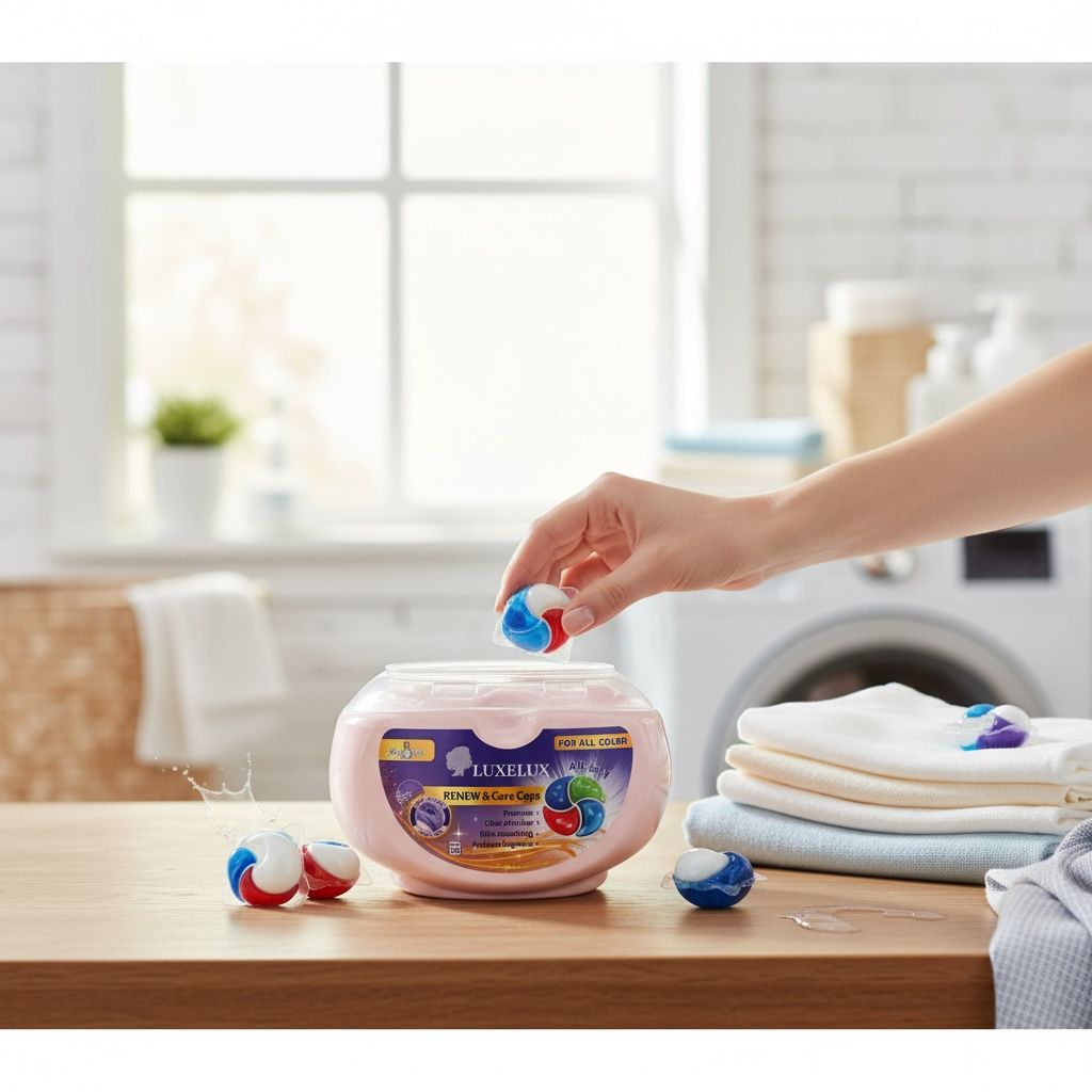 Każda kapsułka zawiera cztery aktywne komory, które zapewniają głębokie czyszczenie, ochronę kolorów, pielęgnację włókien i długotrwały zapach inspirowany perfumami.